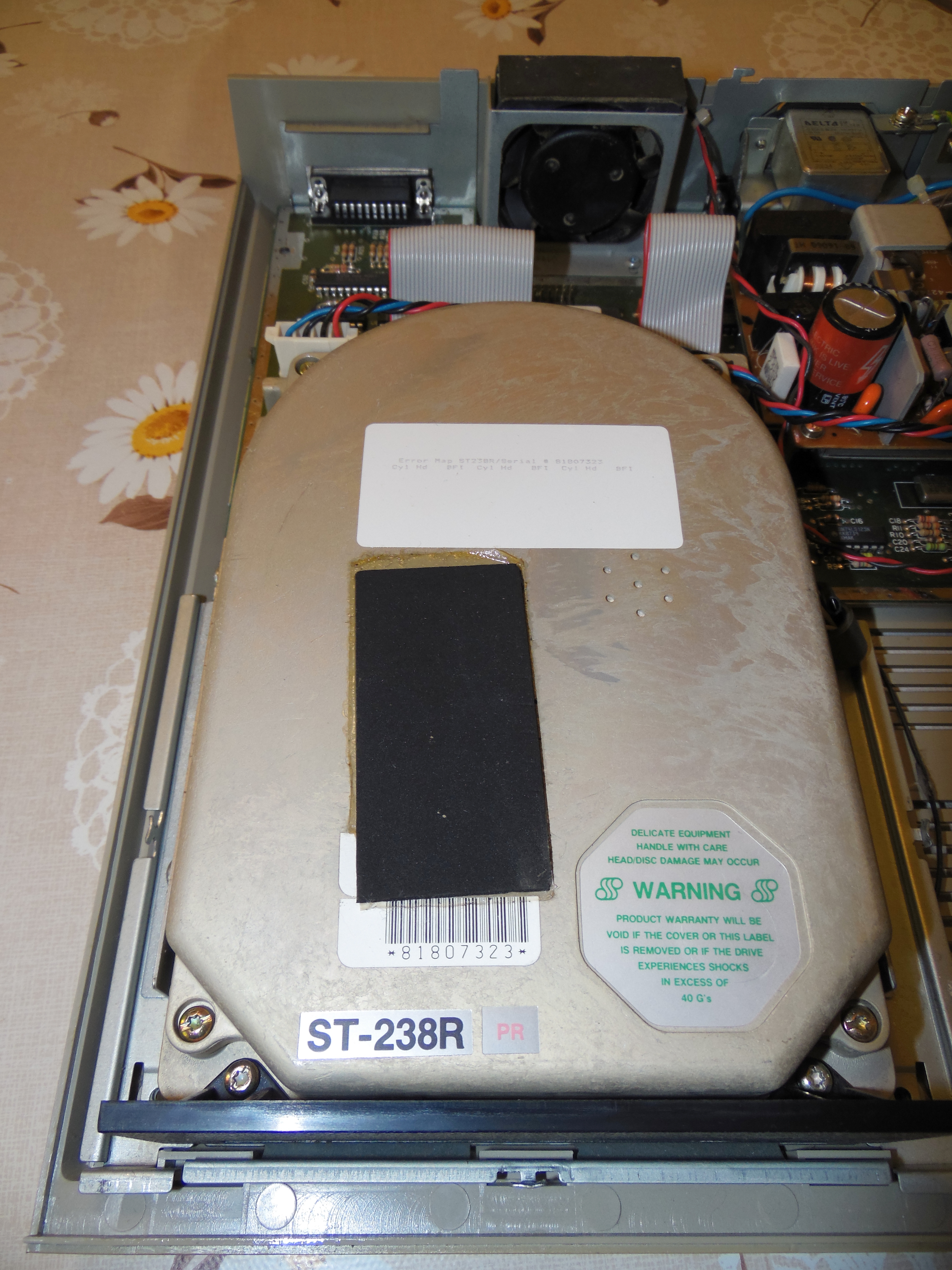 Úgy néz ki, hibátlan kondíciójú 32MB-os, 5,25"-ös Seagate MFM vinyó duruzsol benne. Bár a hangja bekapcsolás után mint a felszálló helikopteré, szépen végigfutott a formázás: